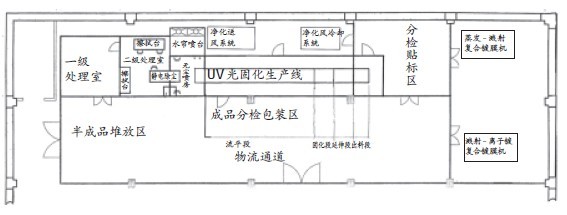 光固化設備是根據生產要求設計制造的,圖1是湖州金泰科技股份有限公司研發中心中試車間的一條光固化涂裝生產線示意圖,其適用于平板和單體產品的連續式生產。工件經底涂后,按產品要求選用真空蒸鍍、磁控濺射、離子鍍等方法進行真空鍍膜,然后重新進入光固化生產線進行面涂,或者采用其他方法對真空鍍膜層進行保護。該光固化生產線由紅外流平段、光固化段、延伸段、進出料段、空氣凈化抽風系統等組成。工件涂膜經光固化后進入真空鍍膜區,那里放置了真空蒸鍍-磁控濺射復合鍍膜機和磁控濺射-離子鍍復合鍍膜機。光固化段共配置了9套紫外線照射燈具(水銀燈):頂燈3支,分別為頂前5.6kW,頂中5.6kW,頂后8.0kW;左右各2支,分別為左上5.6kW,左下5.6kW,右上5.6kW,右下5.6kW;底燈共2支,分別為底前8.0kW,底后5.6kW。燈管可根據上、下、左、右、前、后各個方位調節。整個布局為立方體照射。生產時根據工藝規范選擇開燈的數量和區域。
