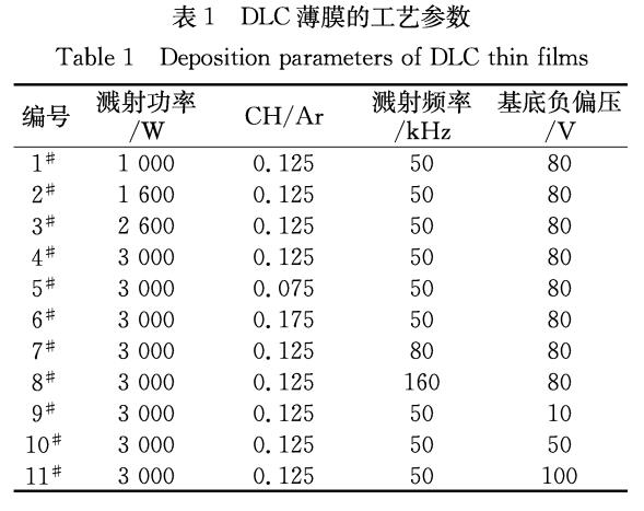 1)磁控濺射DLC薄膜中沉積速率隨濺射功率的增大而增大,隨濺射頻率的減小而增大;隨碳?xì)錃怏w與氬氣流量比、基底負(fù)偏壓的增大先增大后降低,出現(xiàn)極大值。