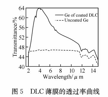 從圖5中可以看出,常溫下,采用磁控濺射技術(shù)在Ge基底單面上制備DLC膜的透過(guò)率達(dá)到63.99%(4.03um),與理論值十分接近(如果將Ge的折射率按4.0計(jì)算,理論峰值透過(guò)率是64%)