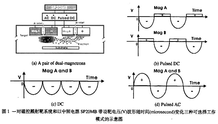 在每半個脈沖周期中。磁控對靶中的一個處于負電位的磁控靶作為濺射陰極,如MagA,而另—個磁控靶作為陽極,如MagB。磁控靶電壓在另半個周期中方向轉換。瞬間陰極生成的二次電子在電場作用下加速向陽極移動,并中和在陽極表面積累的正電荷。非對稱雙極脈沖DC模式的波形示意圖示于圖1b。在這種情況下,在固定的“占位”期間,磁控靶在正常工作電壓(正常范圍為-400v至-600V)下進行濺射。占位時間可以進行設置,使在靶中毒(電荷積累過多)區域的電荷釋放不至于引起擊穿和起弧。由于磁控靶電位在下半個周期中轉變成為相對正值,積累負電荷在“空位”期間通過等離子體進行釋放。由于電子質量比相應離子質量小很多,在等離子體中的電子移動速度要比離子移動速度快很多,在空位期間靶電壓反向成為正常占位電壓的10%,電源的空位時間為12.5us(即整個脈沖周期的50%)。連續DC模式的波形示于圖lc,磁控靶A和B的電壓是相同的正弦波形,且磁控靶A和B的相位差是半個周期。雙極脈沖AC模式的波形示于圖1d,和圖1c類似,磁控靶A和B的電壓是相同的雙極脈沖正弦波形,且磁控靶A和B的相位差是半個周期。