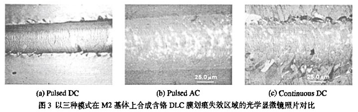 劃痕試驗結果表明在脈沖模式下DLC膜和M2基體之間的結合力要比在連續DC模式下的要高。DLC膜的三次平均臨界載荷Lc,脈沖DC漠式下的為55N,脈沖Ac模式下的為40N,而在連續DC模式下的為25N。以三種模式在M2基體上合成DLC膜劃痕失效區域的光學顯微鏡照片示于圖3。如圖3c所示,連續DC模式下DLC膜以裂紋形式失效,并帶有一些剝離;在脈沖模式下的示于圖3a和圖3b,在脈沖DC脈沖下的在劃痕失效區域仍然保持較為完整的薄膜,只有少數輕微剝落痕跡。