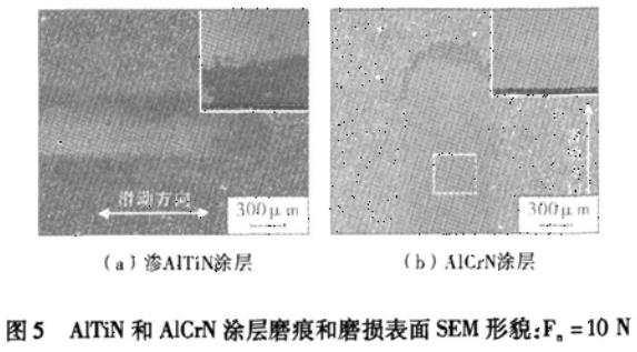(2)AlCrN涂層的耐磨性明顯優于AlTiN涂層。相比AlTiN涂層,AlCrN涂層擁有良好的排屑機制,優越的抗磨粒磨損和抗氧化磨損性能,從而極大地拓寬了PVD硬質圖層的摩擦學應用范圍。