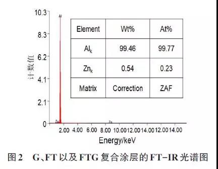 采用傅里葉紅外光譜儀(ThermoSceientificNi-coletiS10spectrometer,ThermoFisherScientificInc.)對(duì)樣品進(jìn)行官能團(tuán)檢測(cè)分析,掃描范圍為600~4000cm-1,粉末試樣采用KBr壓片法制備,實(shí)驗(yàn)前需將粉末在60℃烘箱中干燥24h,研磨后通過(guò)壓片機(jī)制備背景樣品并測(cè)試,將少量粉末試樣與KBr混合研磨,壓制實(shí)驗(yàn)樣品并測(cè)試,測(cè)試系統(tǒng)將自動(dòng)扣除背景紅外圖譜;將G分散在DMF中后真空干燥,采用ZEISSULTRA55場(chǎng)發(fā)射掃描電子顯微鏡(FESEM)對(duì)G和涂層表面微觀形貌進(jìn)行表征分析。