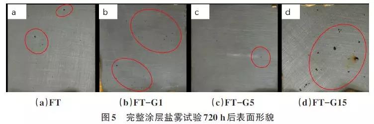 完整涂層鹽霧試驗(yàn)720h后的結(jié)果如圖5所示,圈中部分為涂層發(fā)生明顯點(diǎn)蝕部分。實(shí)驗(yàn)中發(fā)現(xiàn)FT、FT-G1、FT-G15在120h時(shí)均開(kāi)始有少量微孔點(diǎn)蝕產(chǎn)生,且隨鹽霧試驗(yàn)時(shí)間延長(zhǎng)不斷增大增多。而FT-G5涂層的點(diǎn)蝕區(qū)域明顯少于其他涂層,表明其耐蝕性最好。FT-G15涂層的點(diǎn)蝕區(qū)數(shù)量最多,說(shuō)明石墨烯含量過(guò)高對(duì)涂層的耐蝕性有不利影響。這是因?yàn)樵谟袡C(jī)涂層中添加適量石墨烯后,一方面,尺寸極小的石墨烯可以填充涂層孔隙,增加涂層致密性;另一方面,石墨烯片狀結(jié)構(gòu)則可以起到物理屏蔽作用,阻礙腐蝕介質(zhì)在涂層中的滲透,石墨烯的強(qiáng)疏水性對(duì)水分子在涂層中的滲透也起到進(jìn)一步阻礙作用,從而提高涂層的防護(hù)性能;而石墨烯含量過(guò)多時(shí),由于層片間的相互作用而容易發(fā)生團(tuán)聚,在涂層中形成孔洞、縫隙等缺陷,鹽溶液可以通過(guò)涂層缺陷滲透到基體,造成金屬的腐蝕,從而不利于金屬的腐蝕防護(hù)。