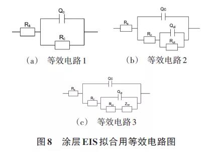 采用圖8所示的等效電路作為物理模型對(duì)EIS圖進(jìn)行擬合分析,可以得到溶液電阻Rs、涂層電容Qc、涂層電阻Rc以及涂層下金屬腐蝕反應(yīng)的電荷轉(zhuǎn)移電阻Rct、雙電層電容Qdl等信息,另外當(dāng)出現(xiàn)擴(kuò)散尾時(shí)引入Warburg阻抗Zw來(lái)擬合。擬合發(fā)現(xiàn),對(duì)于FT涂層和FT-G1復(fù)合涂層,在6~168h階段、288~720h分別用圖8(b)和圖8(c)中的等效電路進(jìn)行較好的擬合,而FT-G5涂層EIS圖在6~288h和360~720h階段分別用圖8(a)和圖8(b)進(jìn)行擬合,F(xiàn)T-G15用圖8(c)所示電路擬合較好。由于涂層電阻(Rc)和電荷轉(zhuǎn)移電阻(Rct)可用來(lái)表示涂層對(duì)金屬基體的防護(hù)性能,因此通過(guò)分析Rc和Rct來(lái)研究涂層的防腐蝕性能。