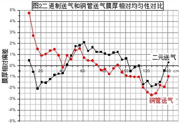 其2中,銅管送氣是氣體從銅管的一端進入,從銅管上均勻開的多個小孔流出進入真空室,由于從進氣端到末端氣體被小孔流出形成壓強漸小,小孔流出的氣體也逐漸減少,形成不均勻送氣;二進制送氣是將氣體均勻的一路分為二路,二路均分為四路,如此均分為多路后送入真空室,可認為是均勻送氣。觀察對比圖中曲線可知二進制送氣情況下,影響膜厚不均勻的主要是磁場,銅管送氣的情況下,膜厚的分布,在磁場影響的基礎上,疊加了一個斜率。這個斜率,正好和銅管送氣產生的壓強梯度相符。壓強大的地方,膜較厚,相反較薄。根據形成不均勻送氣的原理可以推知,膜層厚度的變化斜率可能和小孔的密度,大小和送氣壓力有關,基本關系大概是和小孔密度、大小成正比,和送氣壓力成反比。