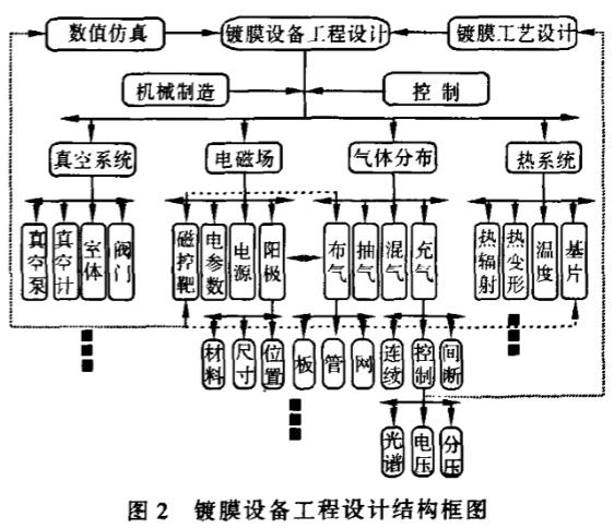 對(duì)于濺射鍍膜來說,可以從真空系統(tǒng),電磁場(chǎng),氣體分布,熱系統(tǒng)等幾個(gè)方面進(jìn)行沒計(jì),機(jī)械制造和控制貫穿整個(gè)工程設(shè)計(jì)過程,參照?qǐng)D2。