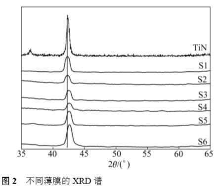 表 1 所列為 6 個樣品(S1~S6)的 EDS 分析結(jié)果。由表1可知,薄膜中N含量(摩爾分?jǐn)?shù))保持基本不變,隨著Si含量的增大,Ti含量逐漸下降。通過改變離子束濺射的束流和磁過濾線圈電流使薄膜中 Si 含量具有較強(qiáng)的可控性,所制備的 TiSiN 薄膜中 Si 含量在 3.2%~15.5%的范圍。