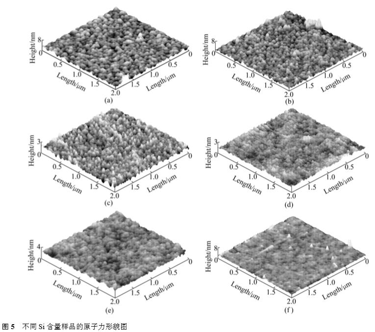 圖5所示為不同Si含量TiSiN薄膜的三維原子力顯微鏡圖。隨著Si含量的增加,薄膜的表面形貌和粗糙度(見表1)發(fā)生了明顯的改變。根據(jù)XRD和XPS結(jié)果的分析,結(jié)合所得的薄膜微觀結(jié)構(gòu)可知,開始少量的Si溶入TiN晶格形成固溶體,薄膜表面仍是柱狀晶生長形成的晶粒凸起(見圖5a~c),隨著Si含量的進(jìn)一步增大,形成的 Si3N4 非晶相的增加,附著在晶粒表面,阻礙了晶粒的進(jìn)一步增大,同時填補(bǔ)了表面晶粒凸起間的凹坑,使得薄膜表面變得更加平滑(見圖 5(d)~(f))。這與已有的研究結(jié)果一致。