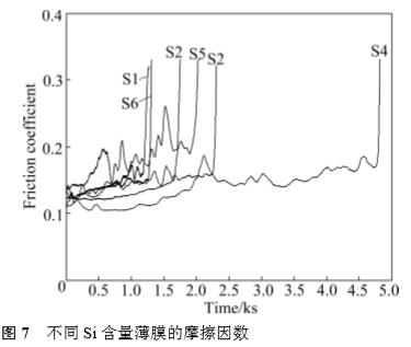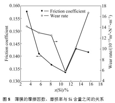 4) 以 Si3N4 為對偶,薄膜的摩擦因數(shù)均維持在 0.13~0.17之間;在Si含量為10.9%時,薄膜的摩擦因數(shù)和磨損率達(dá)到最低值。
