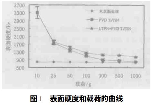 (1)在Cr12MoV鋼上沉積Ti/TiN涂層能顯著地提高Cr12MoV鋼的表面硬度及承載能力。而且,先進行低溫等離子氮化處理的雙重處理更能改善涂層-基體結合條件,顯著提高涂層與基體的結合強度,這歸因于Ti/TiN涂層強化和韌化的作用以及中間氮化層的強化作用。