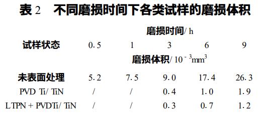 為了更好地評價在Cr12MoV鋼基體上單一處理和雙重處理涂層的耐磨性,本實驗采用高淬高回(未表面處理)Cr12MoV鋼作為對比材料。表2是三種試樣不同磨損時間下的磨損體積。從表2中可以清楚地看到,單一處理和雙重處理后試樣的磨損量明顯低于未表面處理試樣。當磨損9h時,未表面處理試樣的磨損量是單一處理試樣的14倍左右,是雙重處理試樣的23倍左右。很明顯,經表面處理后試樣耐磨性都得到了提高,特別是經過雙重處理的耐磨性更好。