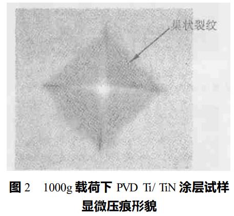顯然,在Cr12MoV鋼上沉積Ti/TiN涂層提高了材料的表面承載能力,特別是雙重處理。這是因為在較小載荷(如10g)作用下,涂層-基體體系是以涂層的塑性變形為主的,承載能力主要來自于硬、韌的Ti/TiN涂層,所以單一處理和雙重處理試樣顯示出高的顯微硬度值,壓痕周圍無明顯的裂紋出現。隨著載荷的增大,基體對測試硬度的影響逐漸增大,雙重處理試樣因有基體離子氮化產生的強化層對涂層的有力支撐作用,因而顯示出比單一處理試樣更好的承載能力,而且,離子氮化減少了涂層-基體界面大的應力梯度,因此在高載荷如1000g下,壓痕周圍顯示比單一處理試樣少的巢狀裂紋。
