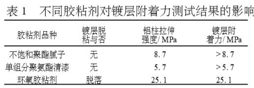 3.1 膠粘劑品種膠粘劑品種的選擇對于鍍層附著力的測試結果有重要的影響。膠粘劑選擇不當,鍍層根本不發生脫落,如選用的不飽和聚酯膩子和單組分聚氨酯清漆,拉伸時破壞均表現為膠層脫落,而鍍層不出現脫落現象。這表明鍍層的附著力遠大于對粘鋁柱的粘接強度。環氧樹脂具有優異的粘接性能,低分子聚酰胺固化的環氧具有較好的韌性,因此選擇651低分子聚酰胺固化E-51環氧膠粘劑體系。使用這種環氧膠粘劑對鍍層進行粘接,能夠使對粘鋁柱拉伸時鍍層脫落。這表明膠粘劑的粘接強度與鍍層的附著力基本相等。分別用不飽和聚酯膩子、單組分聚氨酯清漆和環氧膠粘劑粘接鍍層并測附著力,結果見表1。