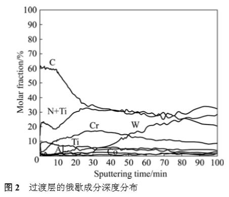 圖2所示為WC硬質合金基體上沉積多元多層梯度膜層樣品的俄歇(Auger)成分深度分布曲線,梯度過渡層依次為基體/Cr/CrN/CrTiAlN/CrTiAlCN(結果與所設計的相吻合),層間界面是一個交匯漸變的過渡過程,對于含量小于5%的信號為儀器基底噪聲所致,N和Ti峰形重疊。