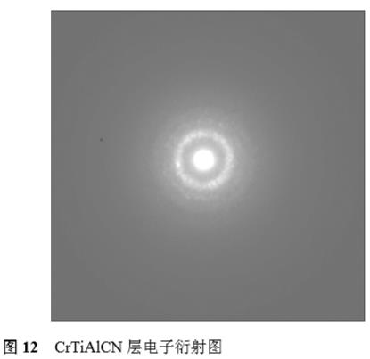 隨著碳元素的加入,膜層中的晶粒細化,沒有出現明顯的柱狀晶或大的晶粒,主要為納米晶(通過測量晶粒尺寸為5~10nm)。圖12所示為CrTiAlCN層的微區衍射譜,由于該膜層中的元素較多,所形成的相較為復雜,既有氮化物,也有碳化物,同時晶粒非常細小(納米晶),因此,衍射環多而弱,無法通過測量計算d。