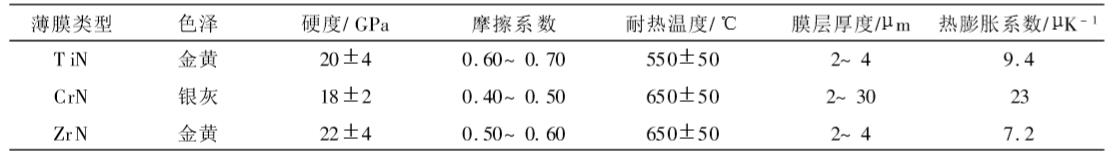 多元復合過渡金屬化合物可組合的種類非常多。表2列出了廣州有色金屬研究院制備的TiCN、TiAlN、CrTiAlN和Ti/TiN/Zr/ZrN多元多層膜的主要性能。