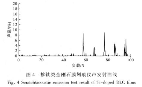 在裝240件316L不銹鋼表殼的條件下,按表1的工藝,所沉積的Ti-DLC膜層厚度約1.1μm。由于膜層薄,在Si基體上測量的硬度為2232Hv。圖4為在不銹鋼基體上沉積1.1μm的膜所測得的結(jié)合力曲線圖。由圖可見,在57N處出現(xiàn)較強信號,結(jié)合在顯微鏡可觀察到該處有較明顯的崩膜,故判斷結(jié)合力為57N。經(jīng)測量摩擦系數(shù)為0.15。