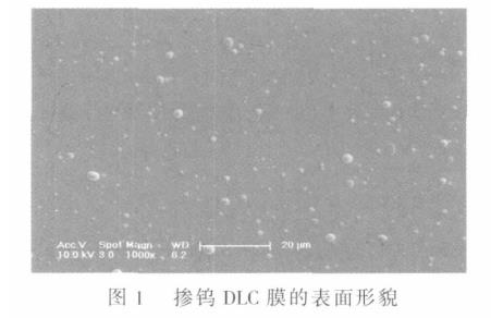 摻鎢DLC表面形貌如圖1所示。從圖1可以看出,摻鎢DLC膜光滑致密,但存在一些大小不一的顆粒和凹坑等缺陷,其尺寸在幾百納米到幾個微米之間變化,最大缺陷直徑小于5μm。這些缺陷可能對應(yīng)于兩種生成機制,一種機制是在摻鎢DLC復(fù)合膜沉積時鎢靶濺射區(qū)表面的介質(zhì)膜沉積引起的靶打火產(chǎn)生的,另一種機制是在過渡層制備時陰極電弧的噴射產(chǎn)生的。前者會導(dǎo)致表層的摻鎢DLC膜中存在較大尺寸的鎢金屬顆粒,在摩擦過程中容易產(chǎn)生DLC膜與對磨件表面的粘著現(xiàn)象,這對進一步改善DLC膜的摩擦磨損性能不利;后者主要引起表面形貌變化,對表層的DLC膜成份和摩擦磨損性能影響較小。為了確定DLC膜缺陷的主要產(chǎn)生機制,利用俄歇電子能譜(AES)對DLC膜平坦區(qū)域、顆粒和凹坑的化學(xué)成分進行了分析,結(jié)果發(fā)現(xiàn)不同區(qū)域均主要由C和W組成,平坦部位(平均鎢原子百分比為2.7%)、顆粒部位(平均鎢原子百分比為2.9%)和凹坑部位(平均鎢原子百分比為2.6%)沒有明顯差別,并且直到刻蝕到500nm時不同區(qū)域的化學(xué)成分仍然基本相同,這表明DLC膜的主要缺陷不是在摻鎢DLC復(fù)合膜沉積過程中產(chǎn)生的,而是過渡層制備時陰極電弧的噴射引起的。