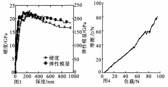 摻鎢DLC膜的納米壓痕實驗結(jié)果如圖3所示。從圖3可以看出,當(dāng)壓入深度為時,壓入深度對硬度和彈性模量的影響較小,摻鎢DLC膜的硬度和彈性模量分別為和200~228GPa。摻鎢DLC膜的劃痕實驗結(jié)果如圖4所示,從圖4可以看出,本研究采用的摻鎢DLC膜的摩擦力-載荷關(guān)系曲線存在兩個突變點,第一個突變點在55N左右,第二個突變點在左右,利用體視顯微鏡觀察劃痕形貌發(fā)現(xiàn)第一個突變點對應(yīng)于DLC膜內(nèi)部不同亞層之間的剝離,第二個突變點對應(yīng)于DLC膜的小面積剝落,可以斷定劃痕實驗臨界載荷為75N,DLC膜具有好的膜/基結(jié)合力。