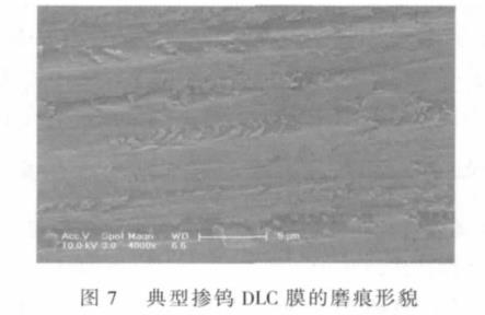 典型的DLC膜磨損形貌如圖7所示,從圖7可以看出,磨痕表面存在明顯的犁溝和膜層內(nèi)部的微觀斷裂。犁溝主要是由于基體硬度低,在磨損過程中DLC膜底部的不銹鋼基體在對摩副壓入時發(fā)生塑性變形引起的;在基體發(fā)生塑性變形時,變形區(qū)域上的DLC膜產(chǎn)生斷裂和剝離現(xiàn)象,能譜分析發(fā)現(xiàn)犁溝底部的化學(xué)組成主要是碳和鎢,這表明摻鎢DLC膜在磨損過程中并沒有發(fā)生直抵基體的大面積剝落現(xiàn)象,僅僅發(fā)生了梯度摻鎢DLC膜內(nèi)部微觀斷裂和不同亞層之間的剝離。