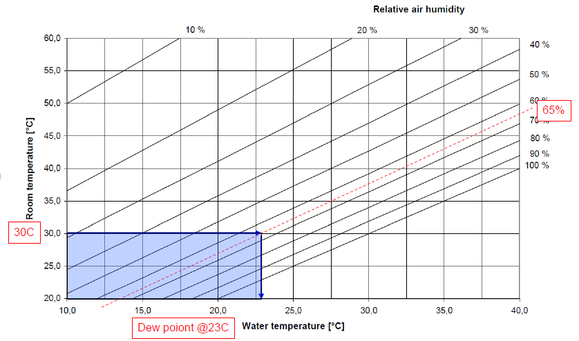 例如:當(dāng)環(huán)境溫度為30℃,環(huán)境濕度為65%時(shí),結(jié)露點(diǎn)為23℃,也就是說冷卻水溫度低于23℃時(shí)會(huì)產(chǎn)生冷凝水,高于23℃就不會(huì)產(chǎn)生。