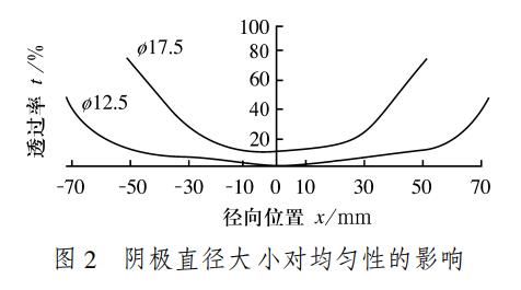采用兩種不同直徑大小的陰極進行實驗,它們的直徑分別為ö17.5mm和ö12.5mm,此時輔助陽極高度為30mm、內徑為40mm、內孔錐度45°,所得結果如圖2所示。在ö70mm范圍內,它們的透過率相對變化分別為±41.7%、。膜厚均勻性沒有明顯變化。可見陰極的尺寸雖然改變了,但它的放電面積變化并不大。要想改善膜層均勻性,必須使陰極表面均勻放電,即弧斑在陰極表面上均勻游動。