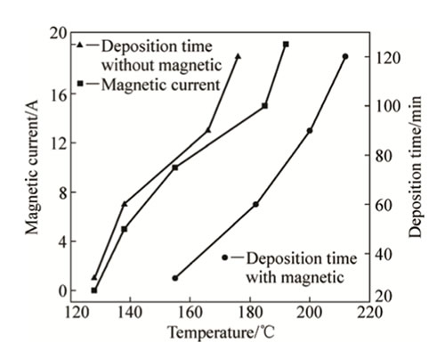 圖1磁場電流和沉積時間與真空室溫度的關(guān)系