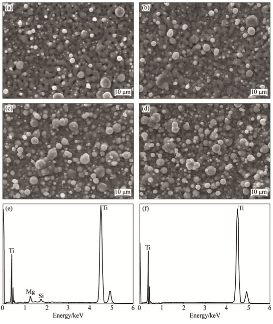 2.3沉積時間對膜層表面形貌的影響圖3所示為10A磁場電流條件下不同沉積時間所得MAO/Ti復(fù)合涂層的表面形貌。由圖3可見,隨著沉積時間從30min增加到120min,膜層表面的熔滴顆粒數(shù)量逐漸增加,但仍不能完全覆蓋MAO膜。同時,隨著沉積時間的增加,微弧氧化MAO膜表面的微裂紋明顯延伸和長大。由圖1可知,外加磁場時,溫度隨沉積時間的延長增加更快。而鎂合金、MAO膜以及Ti鍍層線膨脹系數(shù)存在較大差異,這必然引起MAO膜表面微裂紋的萌生和長大(見圖3(c)~(d))。微裂紋的產(chǎn)生和生長,必然降低微弧氧化膜對鎂合金基體的腐蝕防護(hù)。此外,隨著沉積時間的增加,可見膜層表面的大尺寸液體熔滴顆粒增多,固體顆粒雖也有增加趨勢,但仍以小尺寸顆粒為主。表明磁過濾可有效減少或消除大顆粒,但液體熔滴顆粒的增加以及尺寸的增大,可能與磁場引起的溫度升高有關(guān)。圖4所示為無外加磁場條件下不同沉積時間所得MAO/Ti復(fù)合涂層的表面形貌及元素組成。當(dāng)沉積時間為30min和60min時,復(fù)合涂層的表面仍可見MAO膜的微孔等形貌特征(見圖4(a)~(b));當(dāng)沉積時間為90min和120min時,不能觀察到MAO膜的形貌特征(見圖4(c)~(d))。為了確定Ti鍍層是否完全覆蓋MAO膜,采用EDS對復(fù)合膜層表面進(jìn)行了元素面掃描分析(見圖4(e)~(f))。當(dāng)沉積時間為60min時,復(fù)合膜由Mg、Si和Ti元素組成。Mg和Si來自MAO膜,而Ti來自Ti鍍層。然而,沉積時間為90min時,復(fù)合膜僅由Ti元素組成,而未檢測到Mg和Si元素。由此可確定沉積時間為90min時,Ti鍍層已完全覆蓋MAO膜。與圖3相比,在相同時間內(nèi)的膜層表面覆蓋了更多Ti顆粒;而且,Ti鍍層以大尺寸球形顆粒為主,而液體熔滴幾乎沒有,從而證實(shí)了外加磁場能過濾掉尺寸較大的固體顆粒,大幅度降低沉積速率。