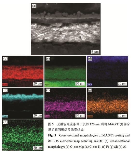 2.4MAO/Ti涂層截面形貌及元素組成圖5所示為無外加磁場條件下沉積120min所得MAO/Ti復(fù)合涂層的截面形貌及元素組成。由圖5(a)可見,MAO/Ti復(fù)合涂層厚度12~13μm,其中MAO膜厚約10μm,Ti鍍層厚度為2~3μm;MAO膜與Ti鍍層之間較為緊密,存在少量微裂紋,這與試樣截面打磨和拋光過程中溫度升高而引起的截面分離有關(guān)。但仍可見Ti鍍層與MAO膜之間的界面有部分互滲的現(xiàn)象,表明MAO膜與Ti鍍層之間不是單純的附著關(guān)系,這有利于增強(qiáng)界面結(jié)合強(qiáng)度。一般的多弧離子鍍涂層具有良好的附著力,其原因之一是轟擊的等離子體攜帶的動能變?yōu)闊崮埽瑥亩鴮w表面產(chǎn)生了一個自加熱效應(yīng),從而提高基體表面層組織的結(jié)晶性能,進(jìn)而促進(jìn)化學(xué)反應(yīng)和擴(kuò)散作用。圖5(b)~(h)所示為截面形貌對應(yīng)的元素面分布,MAO/Ti復(fù)合涂層中存在O、Mg、F、Si、Al和Ti等元素,其中,O、Mg、F、Si、Al來自基體和MAO膜,而Ti來自Ti鍍層。從截面元素O的面分布可見,MAO膜和Ti鍍層之間存在部分互滲的現(xiàn)象。