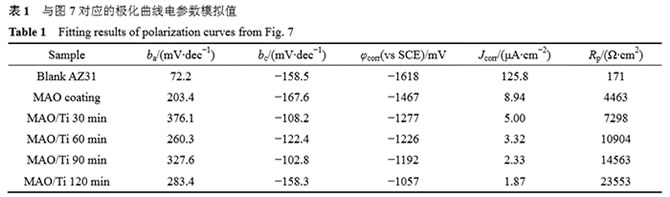 2.6極化曲線由圖2和3可知,引入外加磁場后,在MAO膜表面并未獲得完全覆蓋的Ti鍍層;而且,由于加速的轟擊粒子引起真空室內(nèi)溫度迅速升高,導(dǎo)致MAO膜表面微裂紋的萌生和生長。這將降低MAO/Ti復(fù)合涂層對鎂合金基體較差的腐蝕防護(hù)能力。相反,無外加磁場條件下,隨著沉積時間的增加,在MAO表面獲得了完全覆蓋的Ti鍍層(見圖4(c)~(d))。研究表明,在鎂合金基體表面預(yù)鍍Ti,可提高后續(xù)涂層對鎂合金的腐蝕和耐磨性能。但也有文獻(xiàn)報道,Ti與Mg的標(biāo)準(zhǔn)電極電位相差較大,容易在腐蝕介質(zhì)中形成電偶電池而加速基體腐蝕和涂層剝離。因此,對無外加磁場條件獲得的涂層樣品進(jìn)行了極化曲線測試,考察其對鎂合金基體的腐蝕防護(hù)能力(見圖7),通過電化學(xué)軟件模擬的相關(guān)電化學(xué)參數(shù)值如表1所列。結(jié)合圖7和表1,空白鎂合金AZ31的φcorr和Jcorr分別為−1648mV和125.8μA/cm2,MAO處理后,其φcorr正移了151mV,Jcorr降低了近兩個數(shù)量級。這表明MAO膜能降低鎂合金基體的腐蝕速度,起到了腐蝕保護(hù)的作用。與MAO樣品相比,沉積30min的MAO/Ti復(fù)合涂層樣品的φcorr正移了190mV;Jcorr變化較小,但仍呈現(xiàn)出減小的趨勢。并且,隨著沉積時間由30min增加到120min,其φcorr由−1277mV正移到了1057mV,Jcorr由5μA/cm2減小到1.87μA/cm2。φcorr正移意味著腐蝕的難度增加;而Jcorr的減小說明腐蝕速度降低。此外,MAO/Ti復(fù)合涂層樣品的Rp值明顯大于空白鎂合金和MAO樣品,Rp的增大表明涂層的致密性增加,腐蝕難度進(jìn)一步增大。由此可見,Ti鍍層進(jìn)一步增強(qiáng)了MAO膜對鎂合金的腐蝕防護(hù)能力。