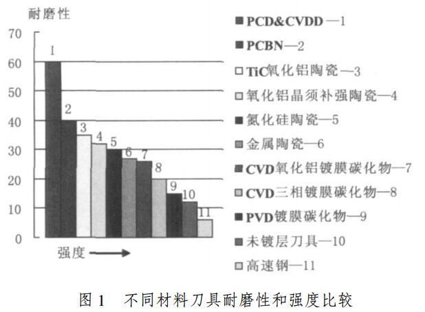 根據(jù)材料的耐磨性和強度,給出了各種刀具材料排序的結(jié)果,如圖1所示。可以看出,金剛石尤其是以純單晶形式存在的金剛石耐磨性最高。但是由于它具有解理面,在受沖擊時往往會表現(xiàn)出脆性,容易被破壞,在所有材料中強度最低。PCBN表現(xiàn)出比傳統(tǒng)的刀具材料如陶瓷更優(yōu)良的性能,其耐磨性僅次于金剛石材料,強度同陶瓷接近,但耐磨性比PCD要差。PCBN在切削耐磨材料中耐磨性分別為硬質(zhì)合金刀具的50倍,涂層硬質(zhì)合金刀具的30倍,陶瓷刀具的25倍。