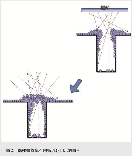 Sputter其主要鍍膜優點是純度高、低溫可形成薄膜,而其最大的缺點就是階梯覆蓋率(Step Coverage)比較差(相較于CVD)。濺鍍本身受到濺射原子多方向與多角度散射的影響下,不易在非水平表面下,得到連續且均勻覆蓋(Conformal)的薄膜。當制作過程線寬極小化的時后,用傳統PVD鍍膜的方式就有其缺陷存在。圖4為階梯覆蓋率不良的示意圖。