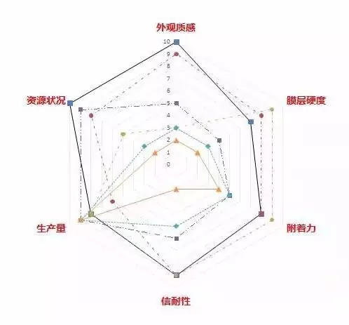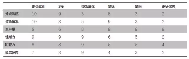 由雷達圖看出,陽極氧化的綜合特性優異,沒有特別明顯的缺陷,特別是其外觀質感最佳,國內生產廠家眾多,技術成熟;尤其適合3C產品的大規模應用。目前,陽極氧化是鋁和鋁合金材料應用最廣且最成功的技術。